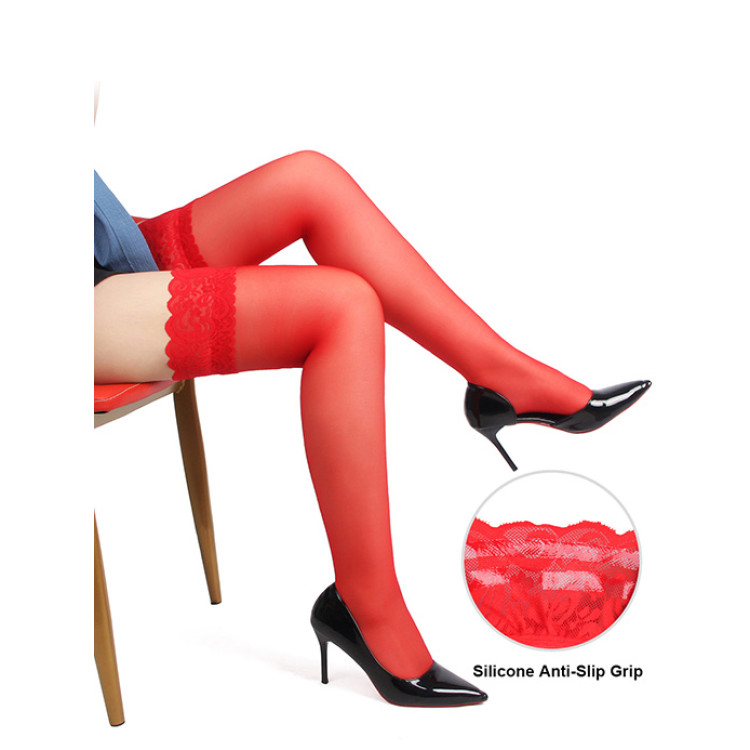 Den lekre blondekanten øverst gir et feminint og forførende uttrykk. På innsiden har strømpene dobbel silikon stripe for å sørge for at strømpene holder seg på plass uten å skli.