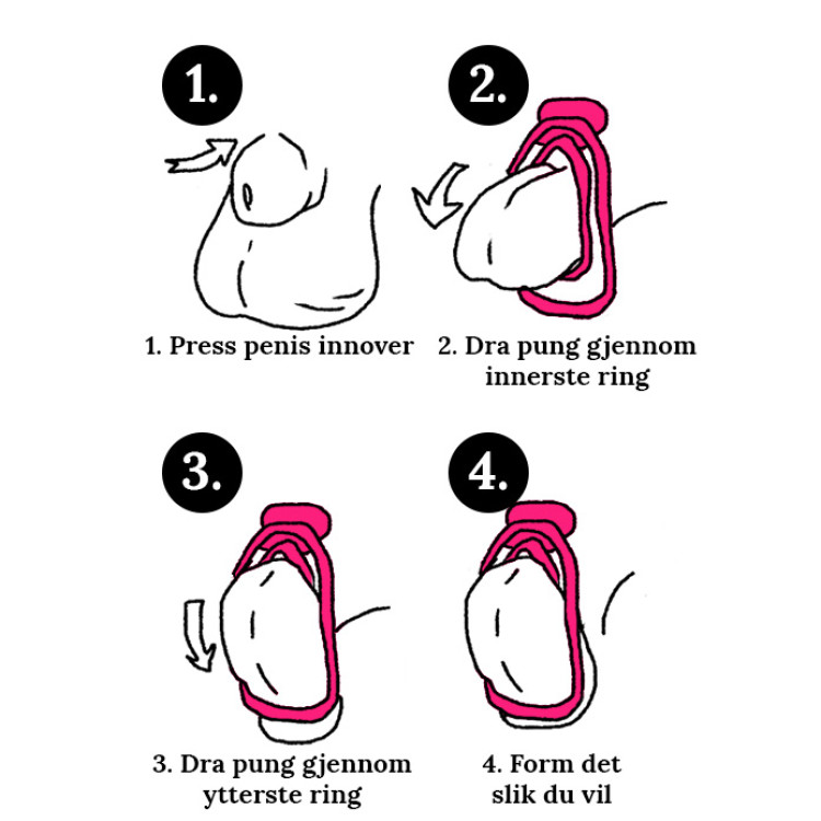 Bruk den indre ringen til å flatlegge penishodet mot kroppen, og trekk så huden til pungen gjennom den ytre ringen. Se diagram i bildekarusellen for inspirasjon. Tips! Det kan hjelpe å dytte testiklene opp i lyskekanalen!