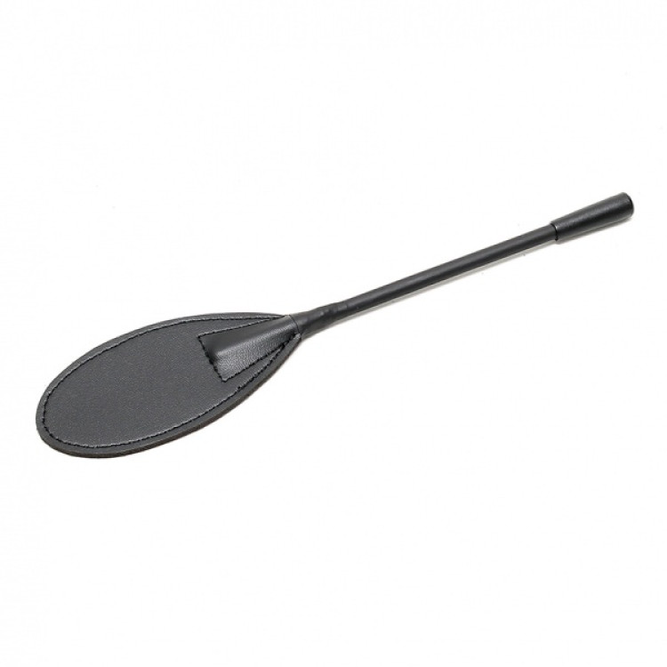 Liten paddle av lær med håndtak av plast.
