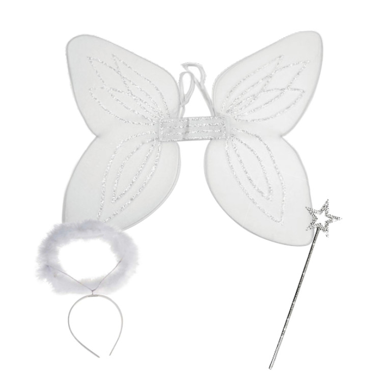 Dette sjarmerende settet inneholder en par enkle engelvinger laget av delikat netting og gnistrende glitter, en magisk tryllestaven med en stjerne og en vakker glorie pyntet med myke fjær.