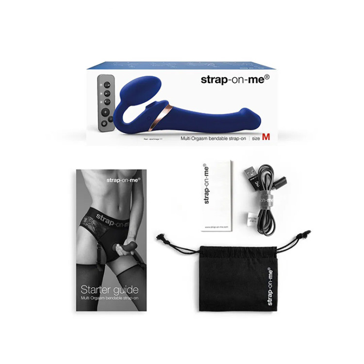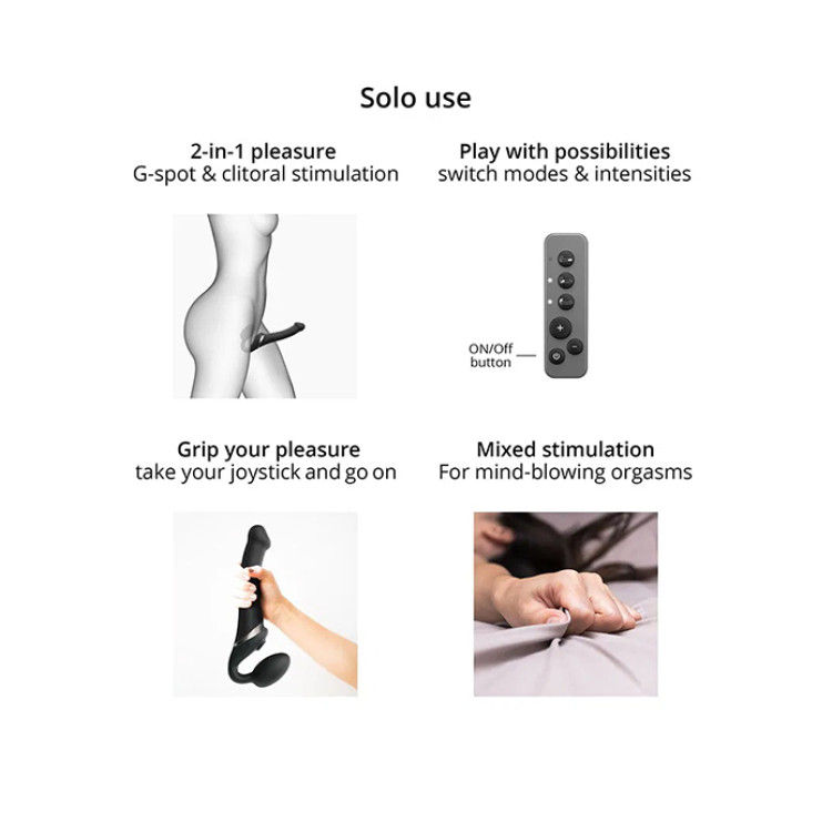 Strap-on-me lar den justere den korte delen ut i fra hvilken vinkel du ønsker at den skal og for å sitte best mulig. Den korte delen brukes vaginalt og holdes igjen av bekkenbunnsmuskulaturen, den gir deg samtidig en deilig g-punkt stimulering ved hjelp av kraftige vibrasjoner. Den lengre delen har en egen motor og vil gi din partner en deilig vibrasjon!