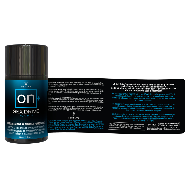 Ingredienser: Vann, capeylsyre/capric, triglyserid, saflorfrøolje, propandiol, cetearylalkohol, cetearylglukosid, ceteareth-20, stearylalkohol, fosfolipider, lecitin, tribulus terrestris, bukkehornkløverfrøekstrakt, (60 % fenuside) macabær, sag palmetto bær, mucuna pruriens, polyakrylat 13, polyisobuten, polysorbat 20, natriumcitratem glukonolakton, natriumbenzoat, kaliumsorbat, dimetikon, rosmarinekstraktolje, kaprifolekstrakt