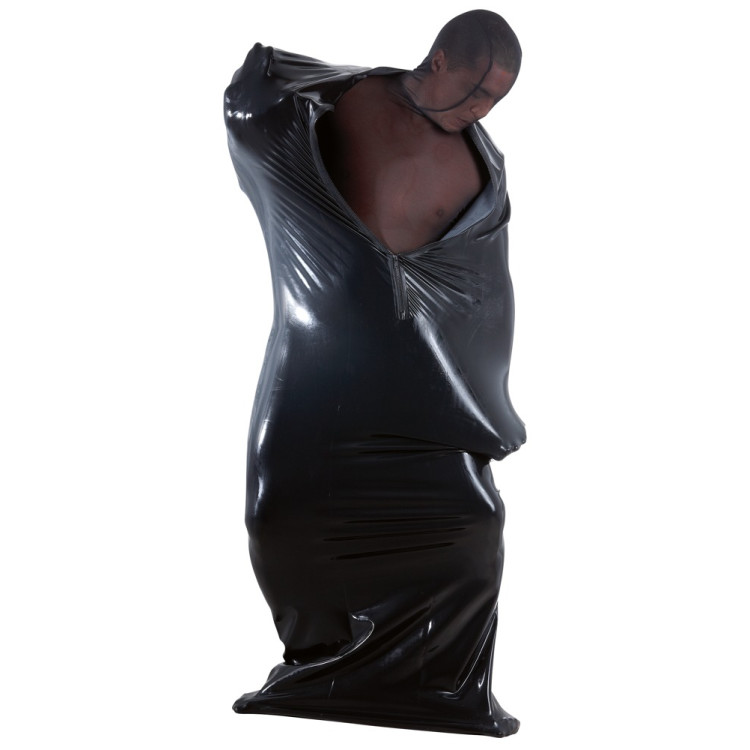 Svart, høyhalset latekssekk med glidelås foran. Selve sekken er 170cm lang og svært tøyelig i alle retninger.