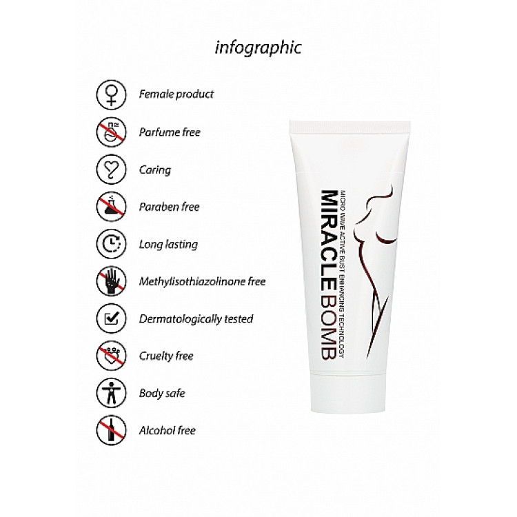 Påfør Miracle Bomb to ganger om dagen rundt brystene og masser den inn med sirkulære bevegelser, fra under brystene til skulderen. Gelen skal masseres inn til den er helt absorbert.
