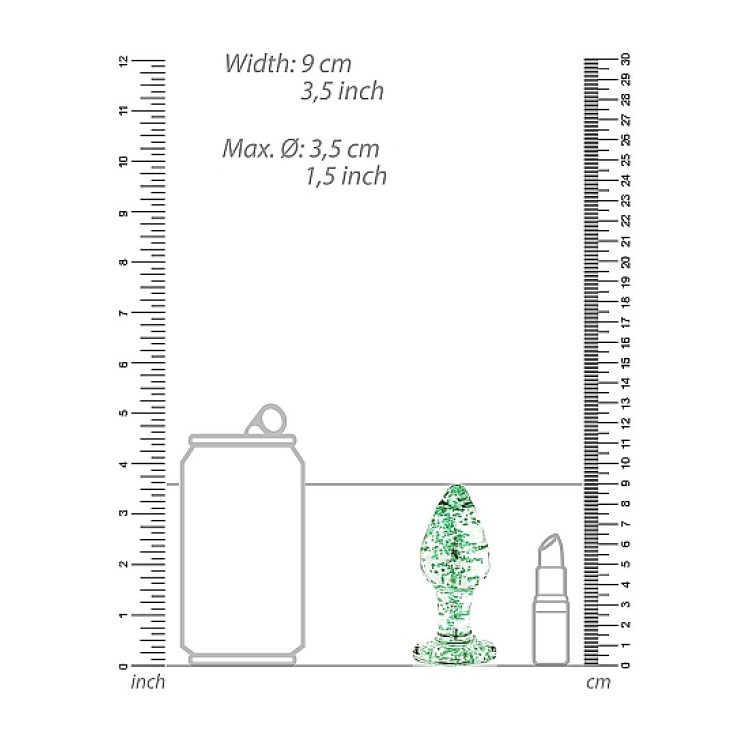 Pluggen er smal i tuppen og blir gradvis bredere, før den svinger inn igjen til en smal hals og ender i en rund stopper. Glassmaterialet er dandert med små dråper med en frekk glow in the dark effekt.