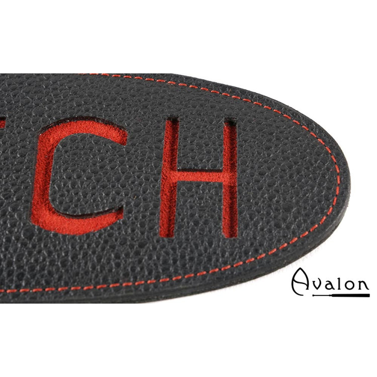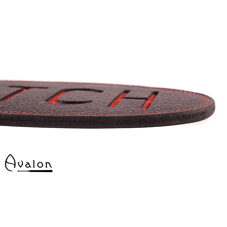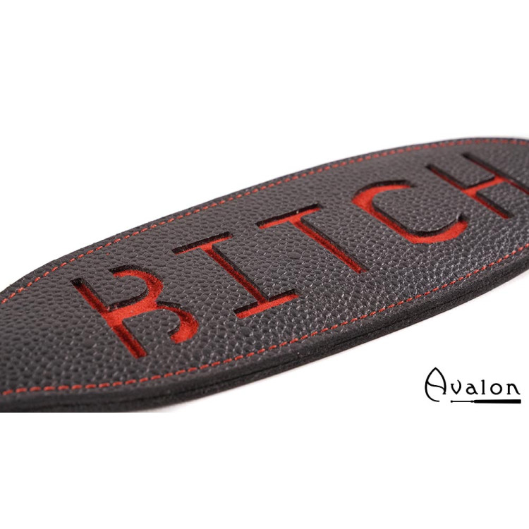 Paddle i kraftig lær med skriften Bitch preget i rødt.