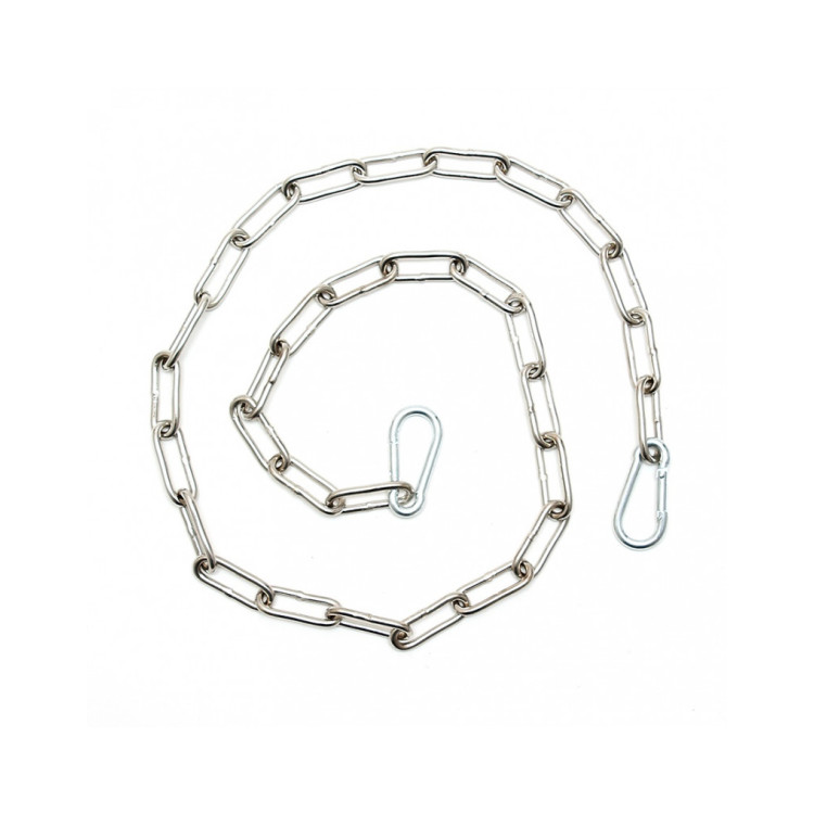 Lang kjetting av rustfritt stål med en karabinkrok i hver ende. Kjettingen er sveiset.