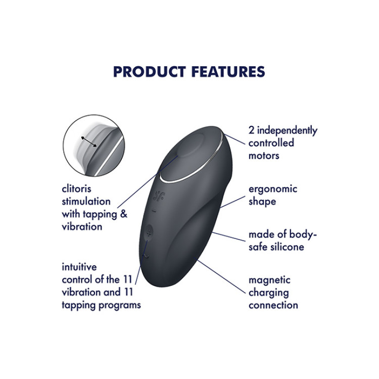 Tap & Climax fra Satisfyer er en spennende klitorisvibrator som bruker en helt ny tappende teknologi for å gi deg deilige orgasmer. Tap & Climax har et elegant design og kompakt størrelse som ligger lett i hånden.