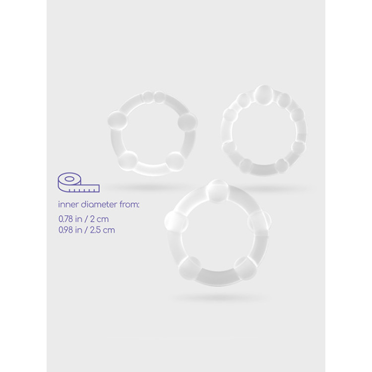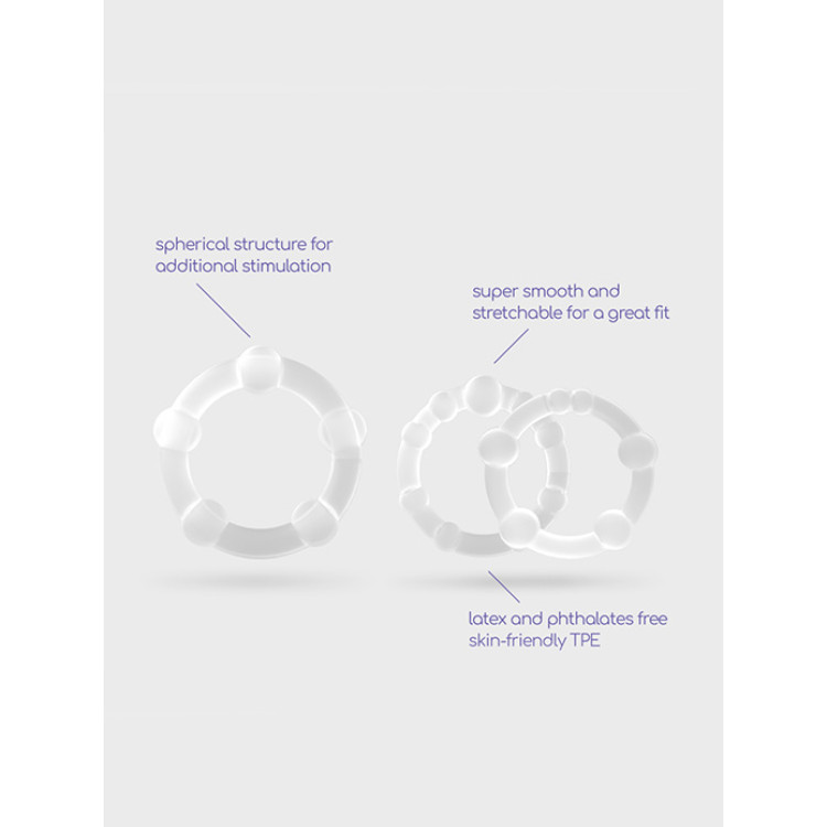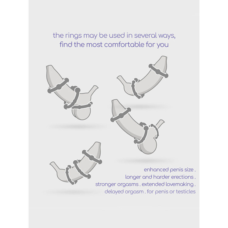 De små knoppene på ringene gir ekstra stimulering, mens det faste grepet bidrar til å forsterke ereksjonen og utsette utløsning. Ringene kan brukes både med og uten partner, og er like godt egnet til solo-lek som til felles moro. Takket være elastisiteten og de ulike størrelsene (2–2,5 cm), kan du eksperimentere og finne den kombinasjonen som passer deg best.
