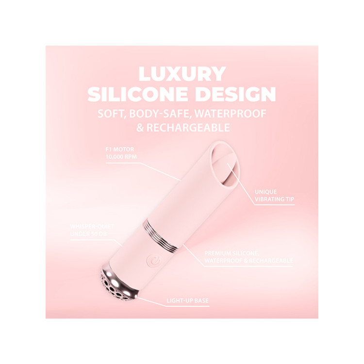 Til tross for størrelsen leverer Luxe imponerende kraft. Den nye F1-motoren spinner opp til 10.000 RPM, men holder seg likevel under 50 dB for en diskret og behagelig opplevelse. Kraften gjør at silikontungen på tuppen går raskt frem og tilbake som en tunge som aldri blir sliten. Overflaten i silkemyk, kroppssikker silikon føles god mot huden, og den vanntette utformingen gjør det enkelt å ta nytelsen med i dusjen. En elegant følgesvenn som byr på presis, intens og luksuriøs stimulering - enten du er hjemme, på reise eller vil ha et lekent øyeblikk på farten.