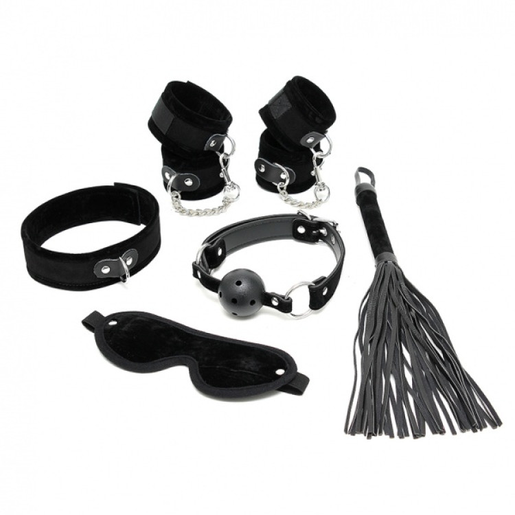 Settet tilbyr øyebind, gag med pustehull og justerbare spenner, hånd- og ankelcuffs med borrelås, collar og en enkel flogger.
