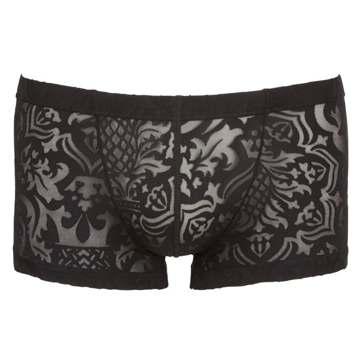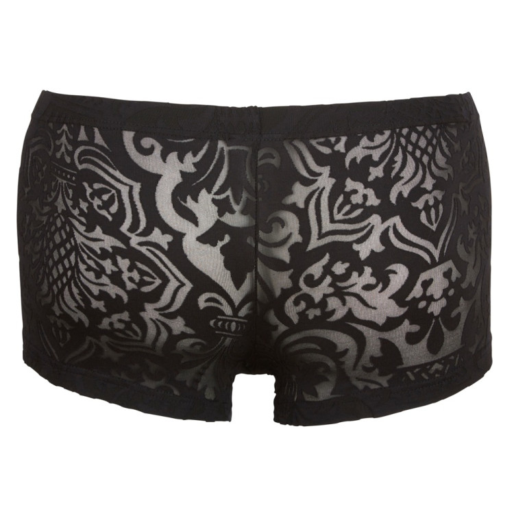 Pirrende, lett gjennomsiktig bokser med brokademønster. Elastisk og myk mot huden.