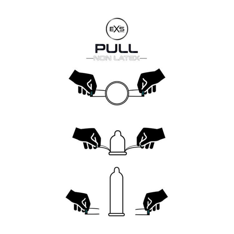 EXS PULL er unikt utforsmet med "strip-system" teknologi og lar kondomene rulle seg sikkert på huden for en tettsittende og behagelig passform. Kondomene er laget av hypoallergent ikke-lateks materiale og er smurt med en silikonbasert formel som gjør de perfekt for vaginal, oral og analt samleie. Uten gummi-lukt eller smak. Kompatibel med alle vann- og silikonbaserte glidemidler.